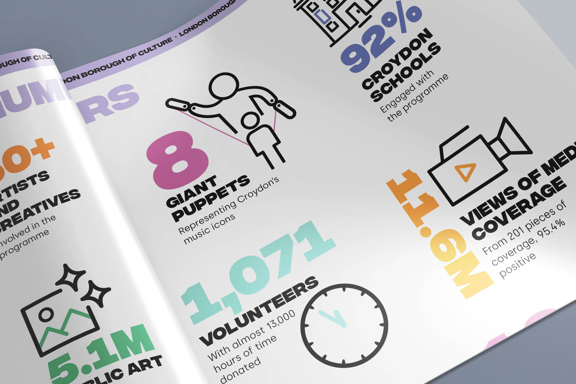 We initially designed two concept routes that looked at ways we could present the infographics and timeline. The visual identity included vibrant colours and interesting photography that we utilised to create a colourful, image lead design that had impact and engaged the reader.